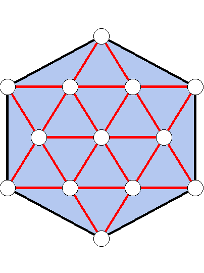 MDS: Version 4.33, 3/24/99 run # 2584 triangulation 1 13 Vertices 0: (211,300) 1: (149,400) 2: (273,400) 3: (335,300) 4: (273,200) 5: (149,200) 6: (87,300) 7: (211,500) 8: (397,400) 9: (397,200) 10: (211,100) 11: (25,200) 12: (25,400) 18 Triangles: 0: 0 1 2 1: 0 2 3 2: 0 3 4 3: 0 4 5 4: 0 5 6 5: 0 6 1 6: 7 1 2 7: 8 2 3 8: 9 3 4 9: 10 4 5 10: 11 5 6 11: 12 6 1 12: 2 7 8 13: 3 8 9 14: 4 9 10 15: 5 10 11 16: 6 11 12 17: 1 7 12 6 boundary edges: 0: 7 8 1: 8 9 2: 9 10 3: 10 11 4: 11 12 5: 7 12 24 interior edges: 0: 0 1 --- 2 6 1: 1 2 --- 0 7 2: 0 2 --- 1 3 3: 2 3 --- 0 8 4: 0 3 --- 2 4 5: 3 4 --- 0 9 6: 0 4 --- 3 5 7: 4 5 --- 0 10 8: 0 5 --- 4 6 9: 5 6 --- 0 11 10: 0 6 --- 5 1 11: 1 6 --- 0 12 12: 1 7 --- 2 12 13: 2 7 --- 1 8 14: 2 8 --- 3 7 15: 3 8 --- 2 9 16: 3 9 --- 4 8 17: 4 9 --- 3 10 18: 4 10 --- 5 9 19: 5 10 --- 4 11 20: 5 11 --- 6 10 21: 6 11 --- 5 12 22: 6 12 --- 1 11 23: 1 12 --- 6 7 6 boundary vertices: 7 8 9 10 11 12 7 interior vertices: 0 1 2 3 4 5 6 r = 1 d = 1