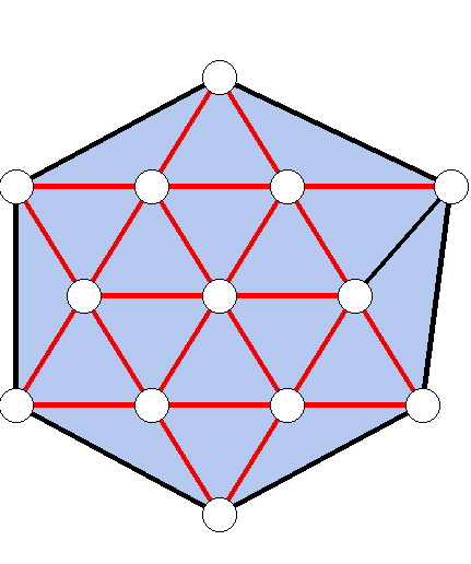 MDS: Version 4.33, 3/24/99 run # 2570 triangulation 3 13 Vertices 0: (300,300) 1: (238,400) 2: (362,400) 3: (424,300) 4: (362,200) 5: (238,200) 6: (176,300) 7: (300,500) 8: (486,400) 9: (512,200) 10: (300,100) 11: (114,200) 12: (114,400) 18 Triangles: 0: 0 1 2 1: 0 2 3 2: 0 3 4 3: 0 4 5 4: 0 5 6 5: 0 6 1 6: 7 1 2 7: 8 2 3 8: 9 3 4 9: 10 4 5 10: 11 5 6 11: 12 6 1 12: 2 7 8 13: 3 8 9 14: 4 9 10 15: 5 10 11 16: 6 11 12 17: 1 7 12 6 boundary edges: 0: 7 8 1: 8 9 2: 9 10 3: 10 11 4: 11 12 5: 7 12 24 interior edges: 0: 0 1 --- 2 6 1: 1 2 --- 0 7 2: 0 2 --- 1 3 3: 2 3 --- 0 8 4: 0 3 --- 2 4 5: 3 4 --- 0 9 6: 0 4 --- 3 5 7: 4 5 --- 0 10 8: 0 5 --- 4 6 9: 5 6 --- 0 11 10: 0 6 --- 5 1 11: 1 6 --- 0 12 12: 1 7 --- 2 12 13: 2 7 --- 1 8 14: 2 8 --- 3 7 15: 3 8 --- 2 9 16: 3 9 --- 4 8 17: 4 9 --- 3 10 18: 4 10 --- 5 9 19: 5 10 --- 4 11 20: 5 11 --- 6 10 21: 6 11 --- 5 12 22: 6 12 --- 1 11 23: 1 12 --- 6 7 6 boundary vertices: 7 8 9 10 11 12 7 interior vertices: 0 1 2 3 4 5 6 r = 1 d = 1