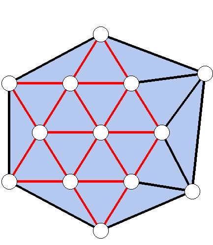MDS: Version 4.33, 3/24/99 run # 2570 triangulation 4 13 Vertices 0: (211,300) 1: (149,400) 2: (273,400) 3: (335,300) 4: (273,200) 5: (149,200) 6: (87,300) 7: (211,500) 8: (397,420) 9: (423,180) 10: (211,100) 11: (25,200) 12: (25,400) 18 Triangles: 0: 0 1 2 1: 0 2 3 2: 0 3 4 3: 0 4 5 4: 0 5 6 5: 0 6 1 6: 7 1 2 7: 8 2 3 8: 9 3 4 9: 10 4 5 10: 11 5 6 11: 12 6 1 12: 2 7 8 13: 3 8 9 14: 4 9 10 15: 5 10 11 16: 6 11 12 17: 1 7 12 6 boundary edges: 0: 7 8 1: 8 9 2: 9 10 3: 10 11 4: 11 12 5: 7 12 24 interior edges: 0: 0 1 --- 2 6 1: 1 2 --- 0 7 2: 0 2 --- 1 3 3: 2 3 --- 0 8 4: 0 3 --- 2 4 5: 3 4 --- 0 9 6: 0 4 --- 3 5 7: 4 5 --- 0 10 8: 0 5 --- 4 6 9: 5 6 --- 0 11 10: 0 6 --- 5 1 11: 1 6 --- 0 12 12: 1 7 --- 2 12 13: 2 7 --- 1 8 14: 2 8 --- 3 7 15: 3 8 --- 2 9 16: 3 9 --- 4 8 17: 4 9 --- 3 10 18: 4 10 --- 5 9 19: 5 10 --- 4 11 20: 5 11 --- 6 10 21: 6 11 --- 5 12 22: 6 12 --- 1 11 23: 1 12 --- 6 7 6 boundary vertices: 7 8 9 10 11 12 7 interior vertices: 0 1 2 3 4 5 6 r = 1 d = 1