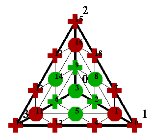 It turns out that the points marked with green and red plus signs form a minimal determining set. Thus the following Bézier ordinates (indicated with plus signs in the Figure) may be set arbitrarily: