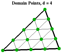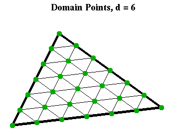 These points form a regular triangular array of (d+2)(d+1)/2 points in the triangle T. They are illustrated for d=4 and d=6 in the Figures nearby (which show the domain points as small green dots).