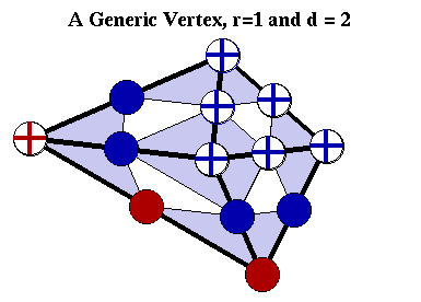 Unlike in the univariate case, the precise location of the vertices matters for the dimension of a spline space. The simplest example is that of a singular vertex. A singular vertex is an interior vertex of degree 4 where the four edges form two parallel pairs. The two figures nearby illustrate minimal determining sets for r=1 and d=2 for a singular vertex and a generic (non-singular) vertex of degree 4.