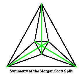 The Morgan-Scott split exhibits a different and more subtle kind of symmetry. It is symmetric if the three lines from a boundary vertex to the opposite interior vertex intersect in the same point as illustrated in the nearby figure on the left. The green lines connect opposite vertices, they are not part of the triangulation!