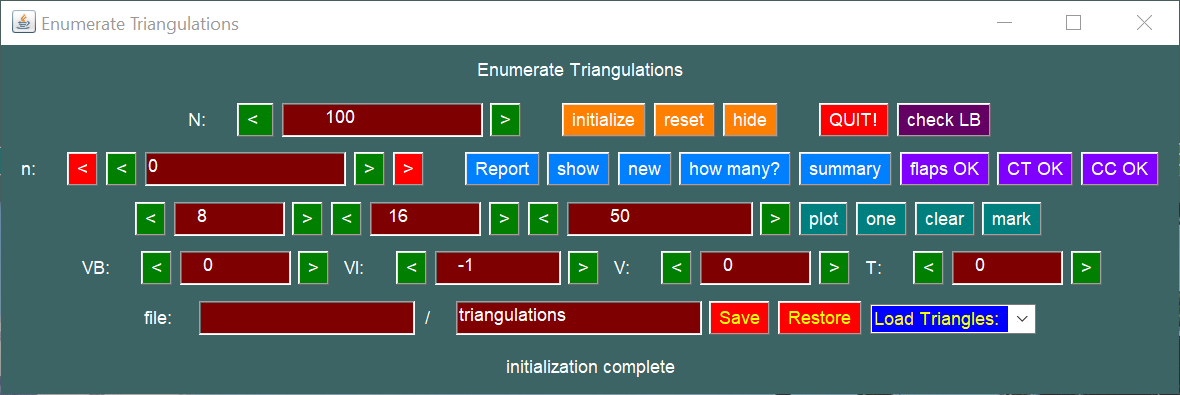 The enumeration mode of the MDS code attempts to compute all possible topologies of triangulations up to a certain number or size. It also has the ability to generate a particular geometry of each of these triangulations, and then display the triangulation and study spline spaces on them.