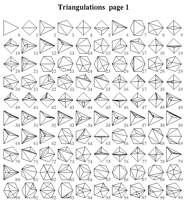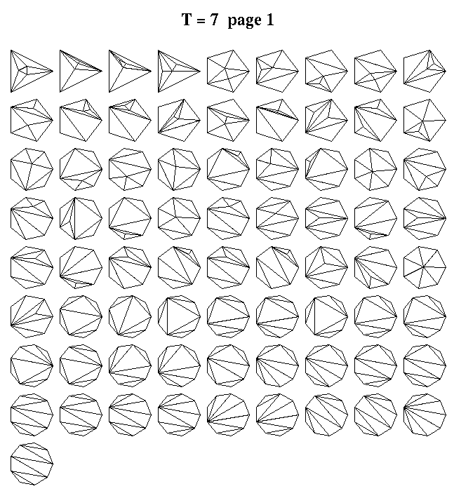 The MDS code has an experimental feature that lets you enumerate all triangulations of certain types. For example, the Figure nearby shows all possible triangulations with seven triangles having no flaps. (A flap is a triangle having exactly one interior edge. If you allow flaps there are 73 distinct triangulations with 7 triangles. )