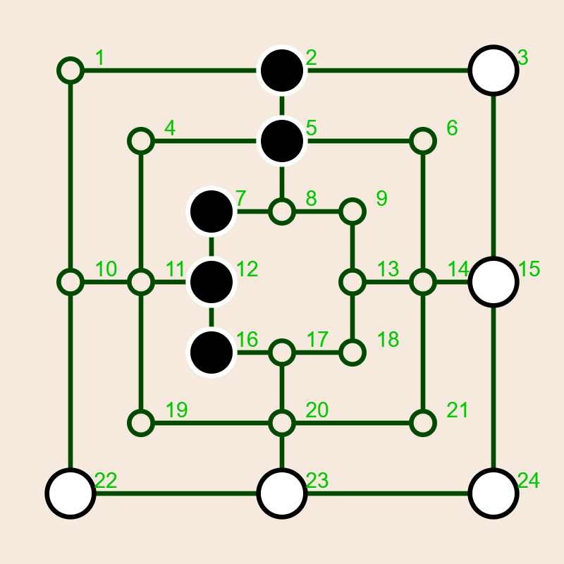 The game of Mill is played on a board like that shown in Figure 1. There are 24 points or vertices connected by edges, as shown. The game is played by two players, traditionally known as White and Black, who take turns placing or moving white or black men or pieces. The vertices in the Figure are numbered for convenience and easy reference, but the numbering is not part of the game.