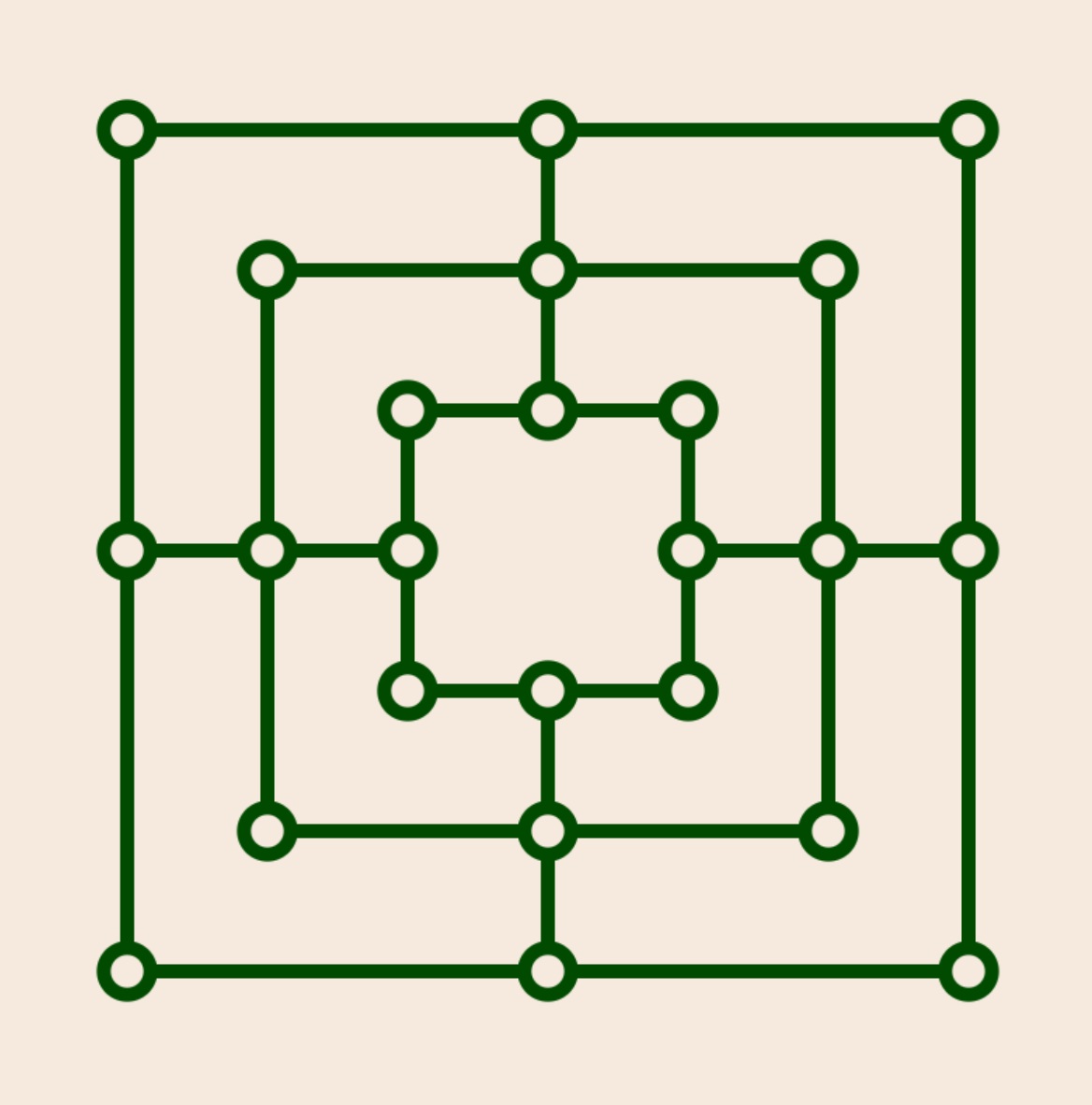 Movement: Once all 18 pieces are placed, players take turns moving a piece to an adjacent empty vertex.