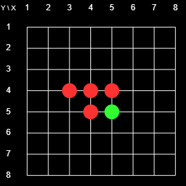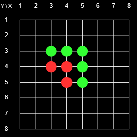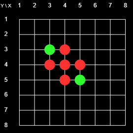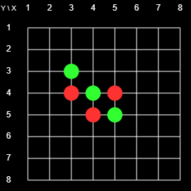 Figure 1 shows the initial state of the 8x8 2D Board. There is a grid with 8x8 = 64 intersections. At the start of the game there are red markers on 4-5 (horizontal-vertical) and 5-4, and green markers on 4-4 and 5-5. The players take turns placing markers on the board. Their goal is to enclose contiguous chains of the opponent's pieces between two pieces of their own. If they can do that the pieces in the enclosed chain change colors. The player with the most pieces at the end wins. For example, at the beginning, Red could play on 4-3 or 3-4 and flip 4-4, or play on 6-5 or 5-6 and flip 5-5.