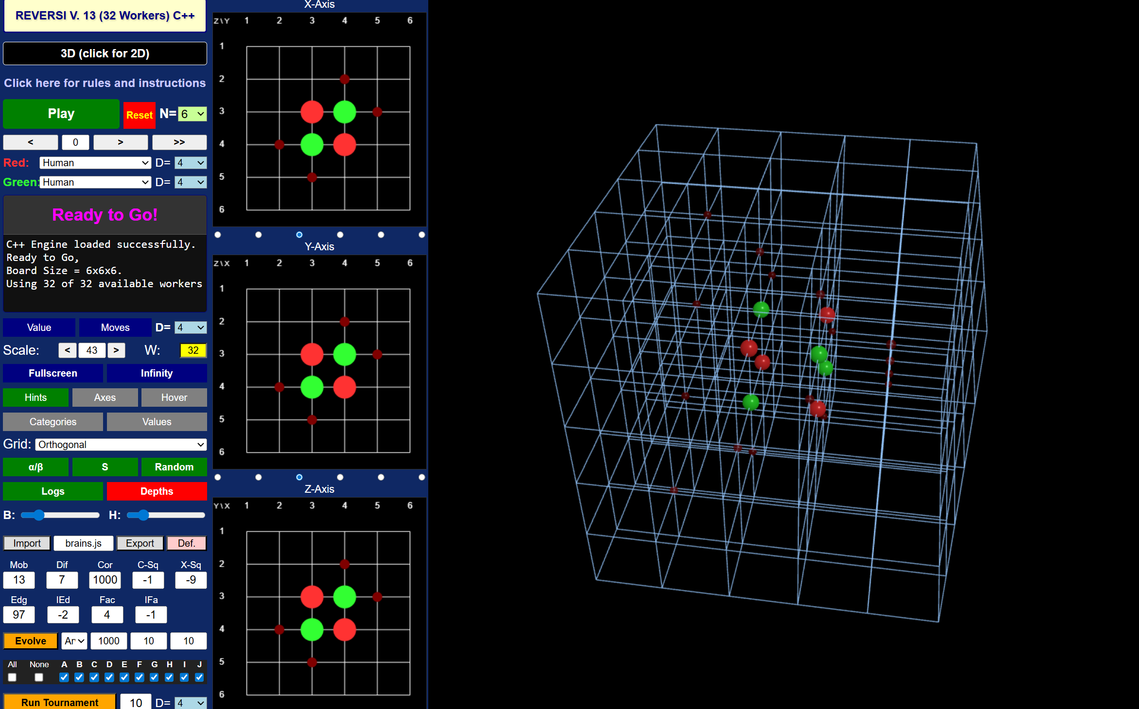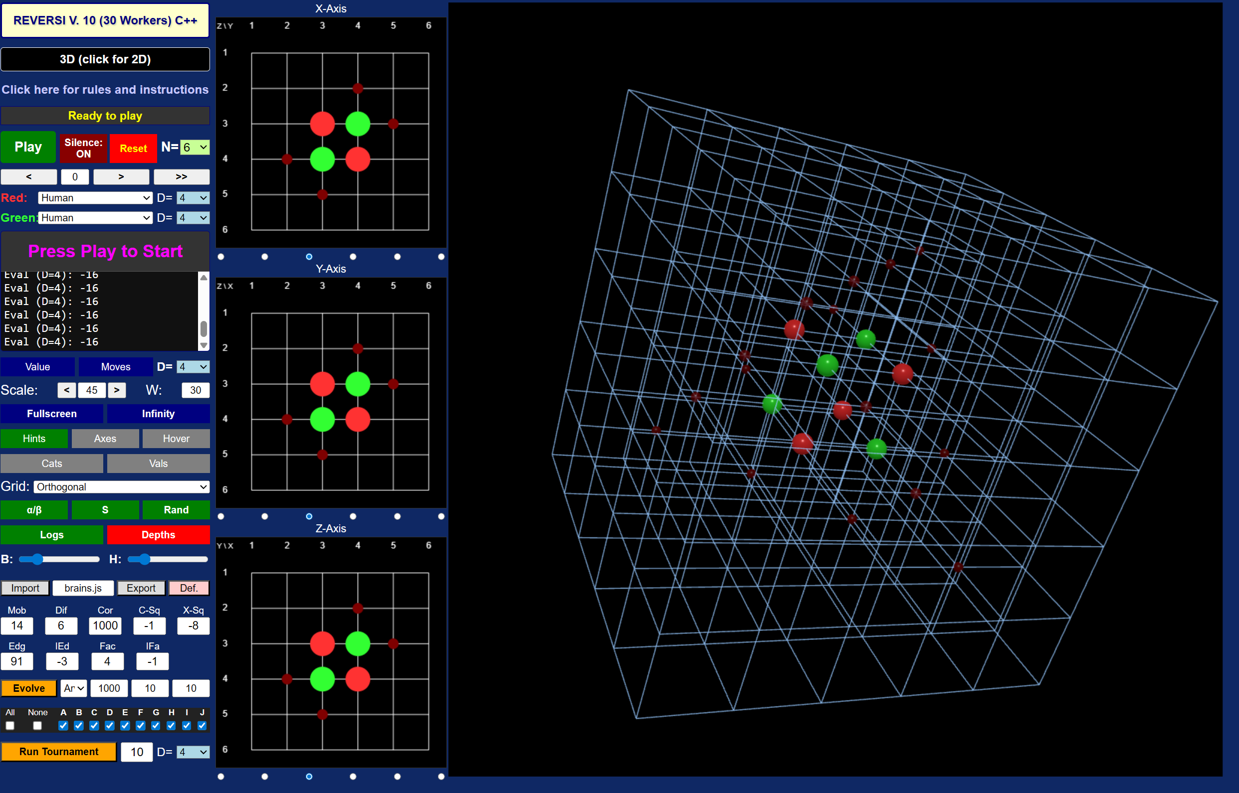 The following Table lists the built-in AI players and their parameters explained above. They are ordered by decreasing performance in a specific tournament on the 6x6x6 board at depth 4, with 32 workers running on Google Chrome, playing 100 games for each pairing, for a total of 9000 games. So Arwen is the top player in that tournament, and Jolly places last, by definition. Jolly's parameters values represent my first guess at reasonable values, all other players are descendants of Jolly, in one way or another, by the built-in evolution process. Multiplying all weights with a constant positive factor will not alter the game play of the AI, therefore the largest weight is normalized to be 1000. All weights are integer. Unsurprisingly, placing a marker in a corner, almost whenever you can, receives the highest priority.