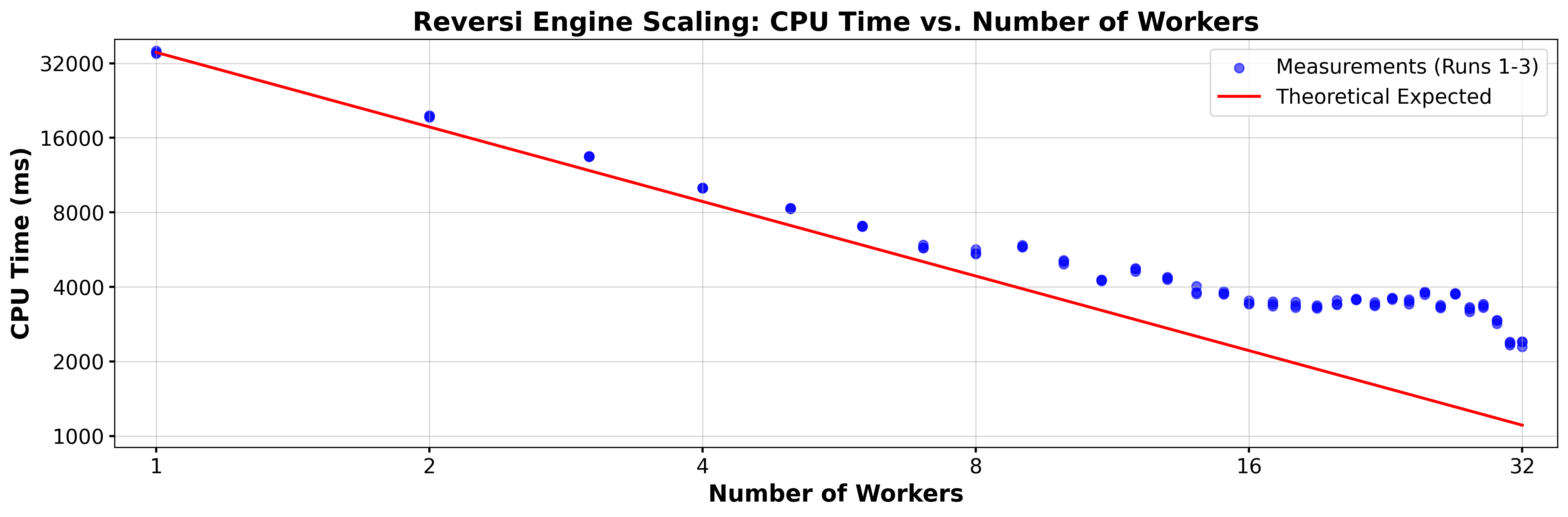 The red line shows what one would naively expect. Thus when using W workers, the CPU time should be T/W where T is the time taken by one worker. The fat looking dots represent the actual wall clock time taken by three separate runs. The fact that those three times are very similar for each number of workers indicates that the shape of the curve formed by the dots is not random. Thus increasing the number of workers in some circumstances actually increases the time used for the calculation. The reason for this is that the evaluation of some positions takes longer than others, and if the number of computer intensive positions is concentrated on a small number of workers the time required will increase. Of course, the precise values of the individual worker times depend on the current position.